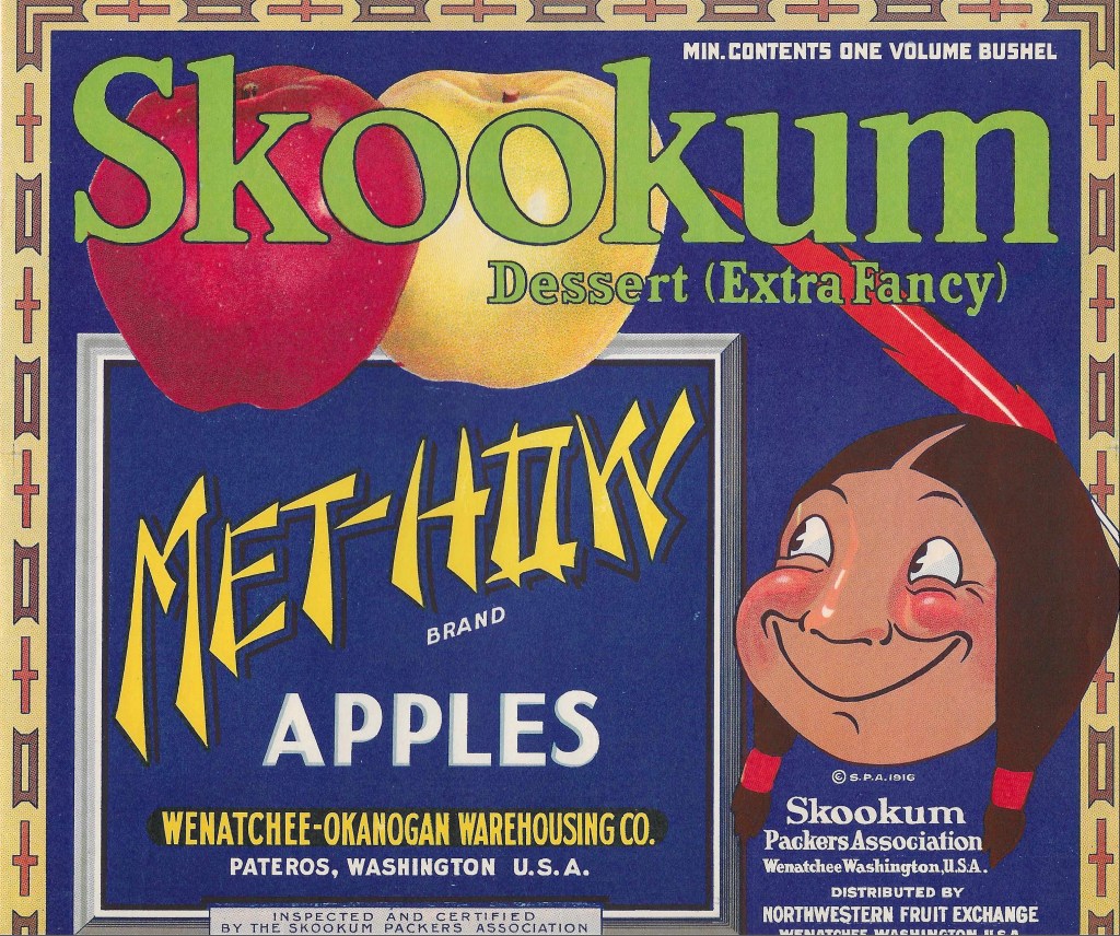 Aside from MEPA, the Wenatchee-Okanogan Warehousing Company, and the Methow Valley Growers Service, there were several other associations that helped market and sell Pateros and Methow Valley apples throughout the United States and elsewhere. An extremely popular and well-known association was the Northwest Fruit Exchange in Wenatchee which sold under the “Skookum” brand, and many associations (and individual growers) worked with Skookum for their advertising, sales and distribution (see 26). As noted for the Smith Orchards, the association called Nuchief also marketed and sold apples throughout north-central Washington, as did Paul Thomas’ Oneonta Trading Corporation and another cooperation called American Fruit Growers. The headquarters for nearly all of these associations was Wenatchee, but they built broad networks of growers, and grower-affiliated associations, to market and sell apples. Apples sold under Skookum, Nuchief, Oneonta, American Fruit Growers, or others, all had characteristic apple labels – several examples of which are shown below.