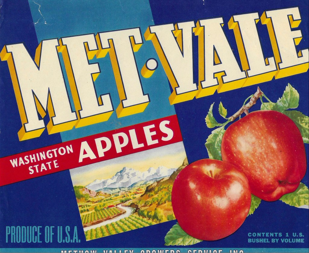 This “Methow Valley Service, Inc.” association sold apples using a well-known, albeit rare, apple label which reads, “Met-Vale Washington State Apples” in text across the front with a blue background, red apples, and an agricultural scene in the background. The association name was printed as the “Methow Valley Growers Service Inc.” – which is undoubtedly the same association. Interestingly, articles in the May 30, 1957, and March 22, 1962, Quad City Herald reporting on local companies supporting the Pateros High School and its graduates listed sponsors including Methow-Pateros Growers, Inc. (Pateros), Methow Valley Growers Service, Inc. (Pateros), Larrabee and Neff (Pateros), Methow Packers, Inc. (Methow), Starr Ranch (Pateros), and an orchard further south along the Columbia River, A.Z. Wells Orchards (Azwell). Sponsors also included the Brewster Co-Operative Growers and Mutual Apple Growers (also in Brewster).