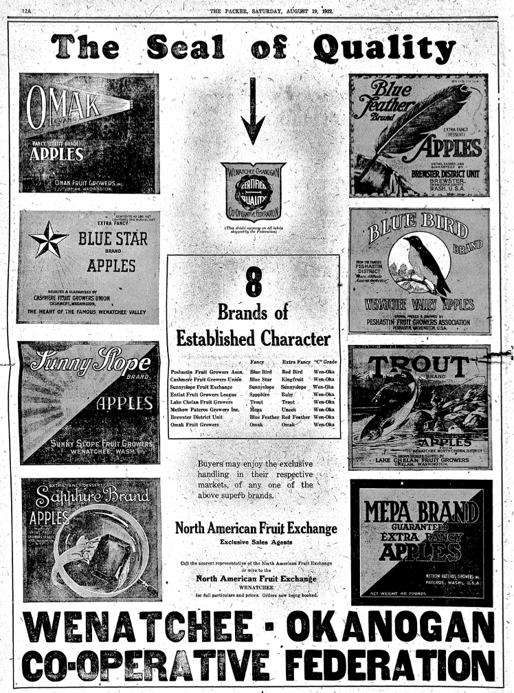 The history of each of these cooperatives is complex because various associations would sell apples under their own brand, as MEPA did, but would also join with other advertising companies or cooperatives to sell fruit under joint brands. They also tended to use name variations which easily leads to confusion today. Take for example the Wenatchee-Okanogan Warehousing Company. The Yakima Valley Museum has an extremely rare apple label in their collections with a yellow background, a red apple on the side, and a megaphone with text coming out of the megaphone stating “WOW Brand” apples which were packed and shipped by the “Wenatchee Okanogan Warehousing Co.” in Pateros (16; see also figure below). But, this apple brand and the warehouse itself was not associated with the 1922 establishment of the north-central Washington cooperative based in Wenatchee called the, “Wenatchee-Okanogan Co-Operative Federation.” A brand we know today as “Wenoka”. To make this more confusing, Wenoka branded apples, from their establishment in 1922, included a relationship with MEPA. Essentially, Methow-Pateros Growers Inc. apples were sold jointly under a MEPA and a Wenoka brand/label. Often the Wenoka image was added to standard MEPA labels. An August 1922 The Packer newspaper page helps visualize the various brands that sold with Wenoka – including different MEPA apple labels for various grades.