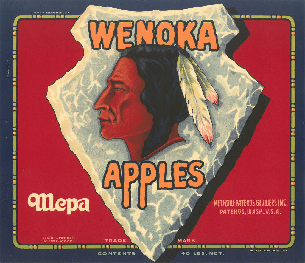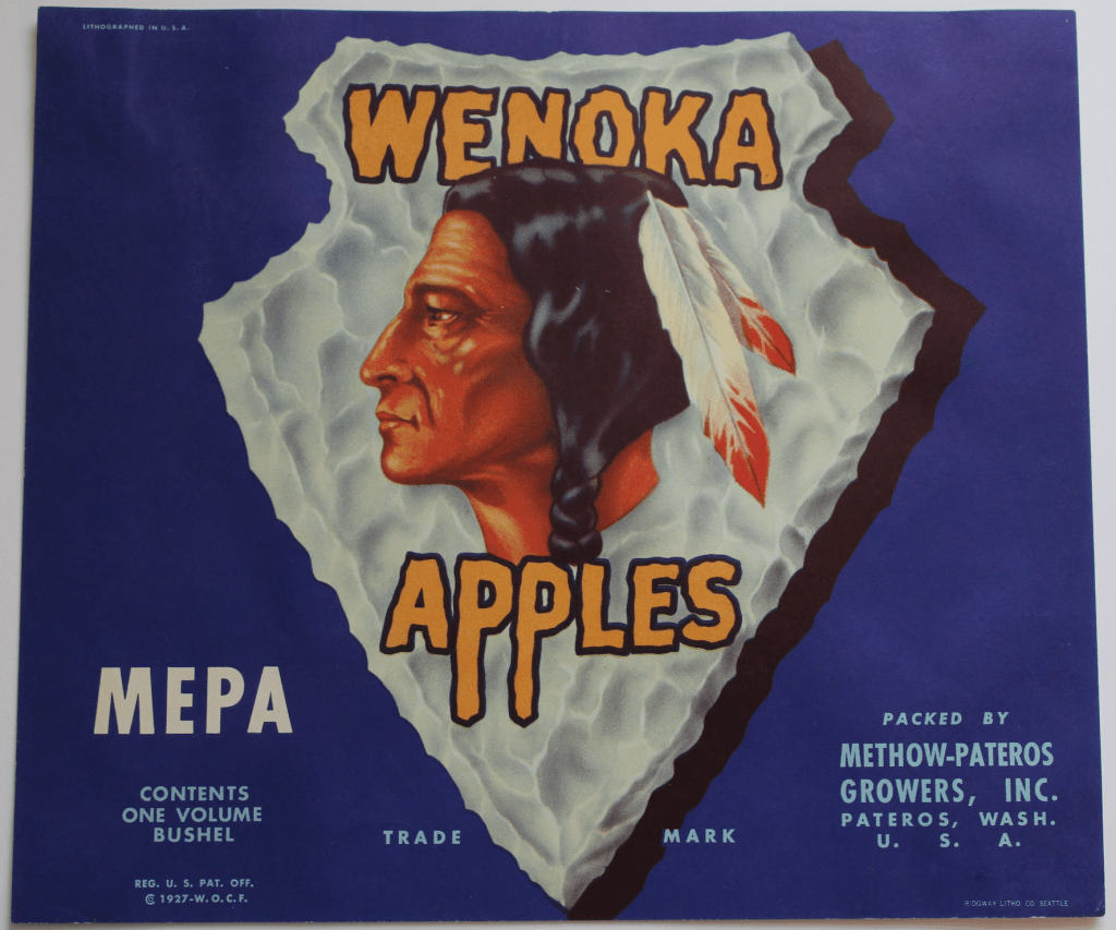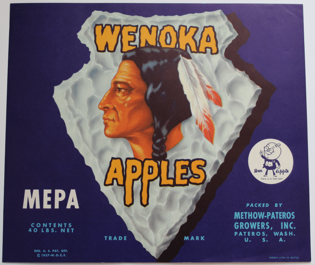 For Methow-Pateros Growers Inc., their standard apple labels included variations of the text “MEPA Apples” with a square, diagonally bisected by two different colors. They also sold different grades of apples under the “U-Neek” brand, which used the same square shape with different colored sections. Apples sold with Weonka included the Wenoka brand symbol on the label as well – and in contrast, Wenoka labels were also created that used their advertising imagery along with the text “MEPA” apples, indicating that pack came from Methow-Pateros Growers Inc. Examples of this imagery are shown below.