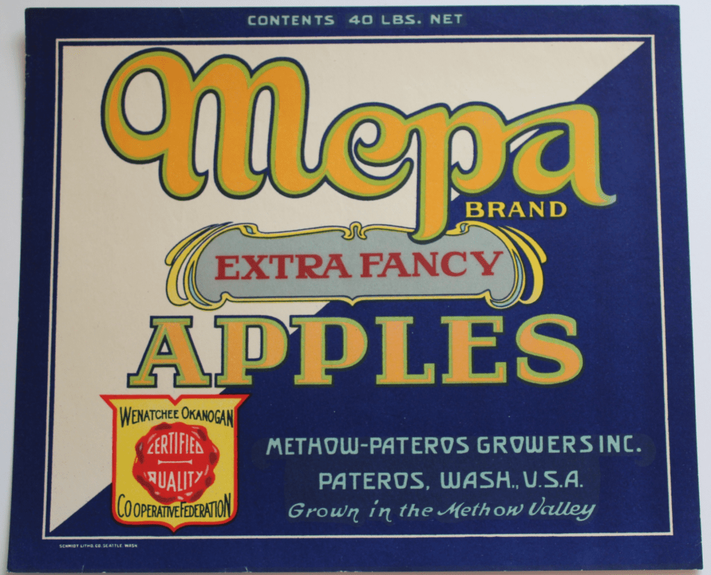 As described in the September 9, 1922, issue of Chicago’s The Packer, Methow-Pateros Growers Inc. – also known as “MEPA” – began as a cooperative association of growers in 1916. F.H. Logue was one of the founding members and was the cooperative manager for many years. It is unclear exactly how many individual growers participated and worked with MEPA, but it is fair to guess that many Pateros and Methow Valley families stored and sold their apples under the brand at any one time.