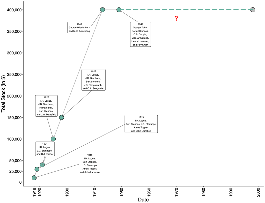 One visualization (see below) helps highlight the tremendous growth of MEPA throughout the early part of the 20th century. When MEPA incorporated in 1918 it had $10,000 in stock. By 1925, it’s stock value had increased to $100,000, and by 1949 (the last date where known records exist), the value had increased to $400,000. And, as previously noted by the Okanogan Independent, MEPA’s managers and board of directors remained dedicated and consistent throughout this period, no doubt helping their community of growers survive war, the Great Depression, floods, frost, and much more.
