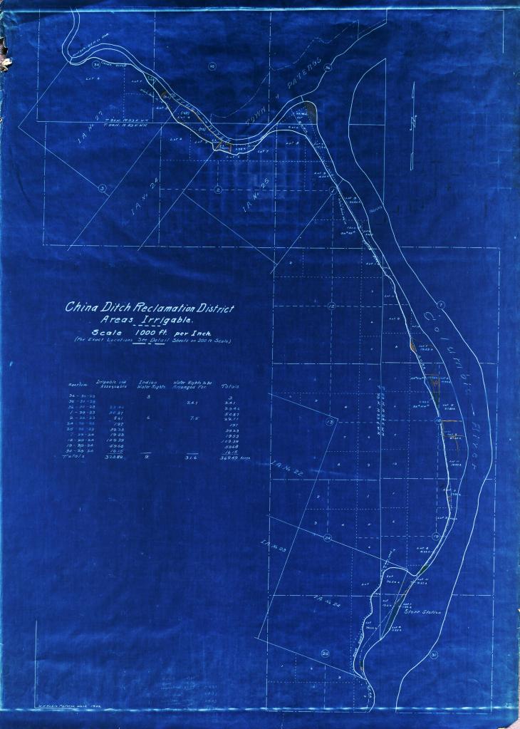 One of the interesting aspects of the Starr Ranch is that R.W. Starr bought the original “China Ditch” running along the Methow River through Pateros, down the Columbia River, which he both enlarged and extended to irrigate his orchards (23) in the early 1900s. This likely occurred shortly after he founded the ranch in 1911. A Washington State Archives historical 1922 map of the “China Ditch” through Pateros shows it ended at “Starr Station” along the Columbia River.
