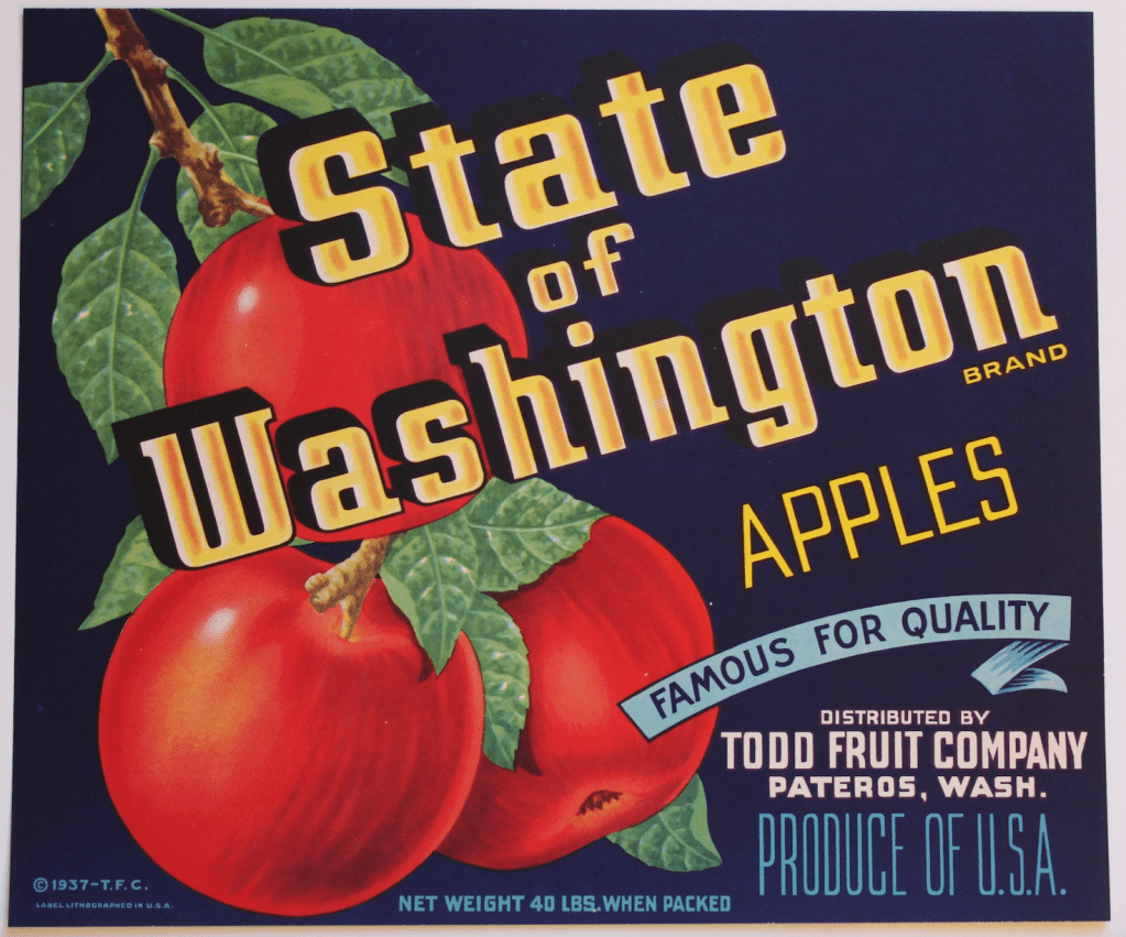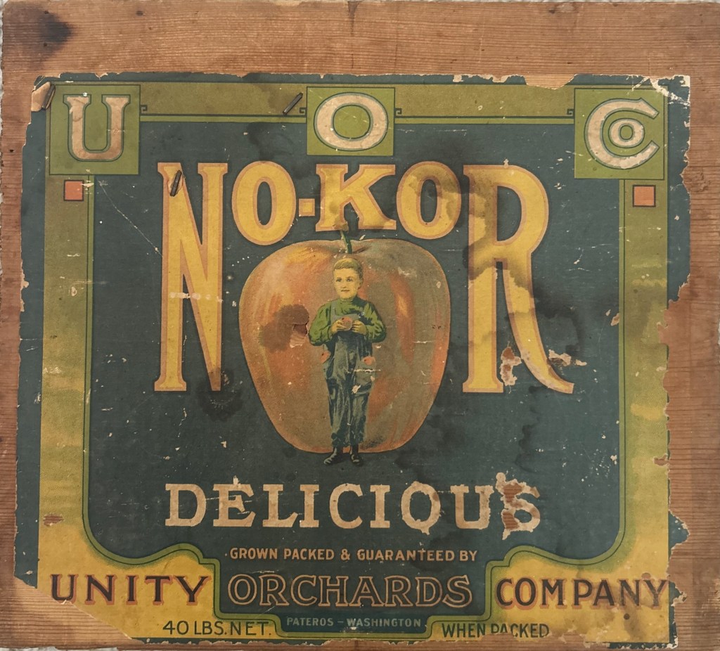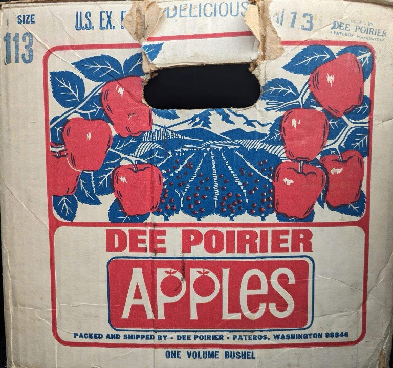 There is also the well-known “Twisp River” apple label from the Child and Thompson families out of Carlton, and although I have not documented a detailed record for these families, I am certain it exists and suspect it likely matches a similar type of growing, packing, and selling relationship as Larrabee and Neff, or Starr. Then there are growers who arrived in Pateros and the Methow Valley during the mid- to late-20th century and sold under their own brands using, by that time, cardboard apple boxes. Dee Poirier’s brand and orchards along the Methow River north of Pateros is a good example (see below). Apple brands that originally packed and shipped using wooden crates and labels also eventually adapted to cardboard boxes during this period.