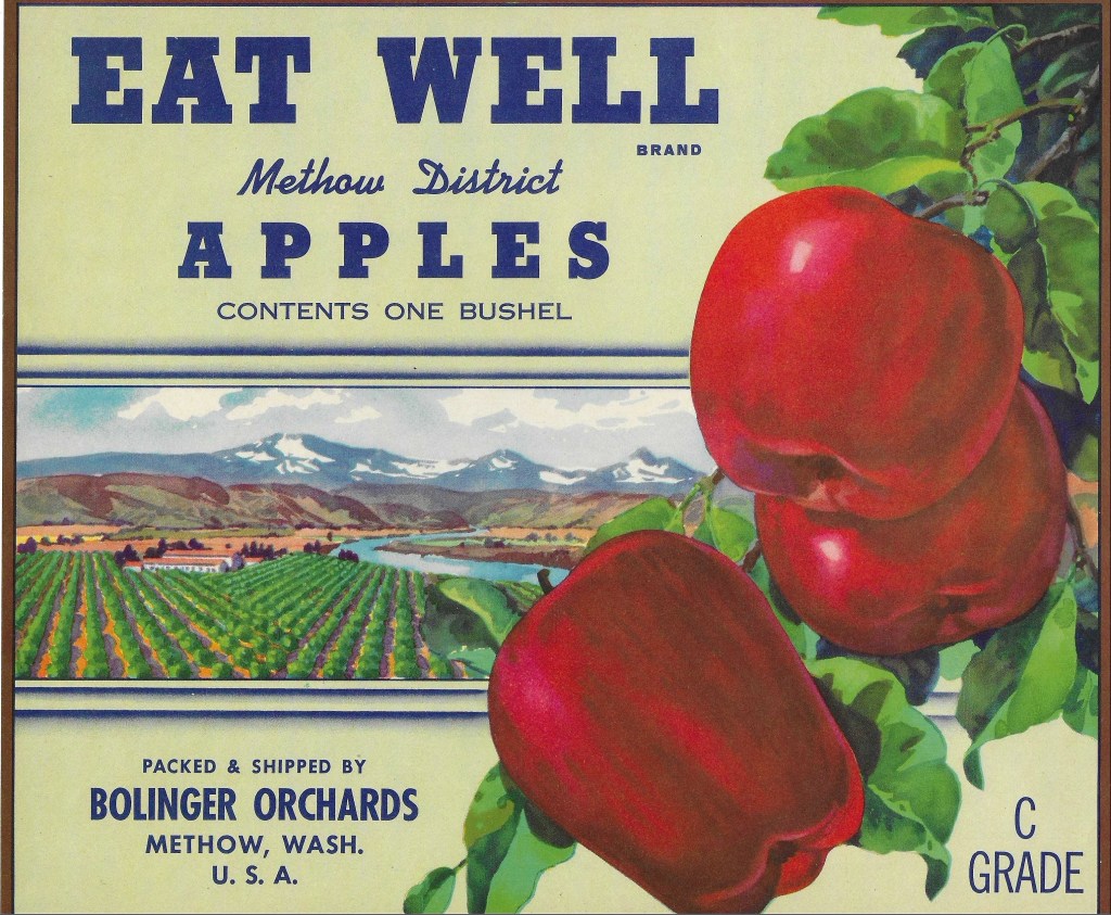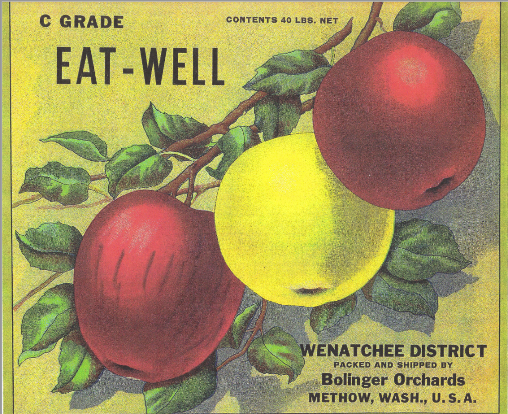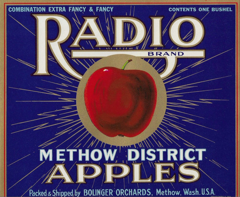 Over successive decades the Bolinger’s apple advertising used a combination of unique text and images – including some stock format depictions of landscapes and orchards – to advertise their apples. Two distinct apple labels from the Bolinger orchards include the “Radio” and “Eat Well” brands. By 1928, when the Better Fruit magazine published their list of “Pacific Northwest Carlot Apple Shippers and Their Brands,” Methow was represented only by the Bolinger’s (and specifically W.A. Bolinger) including their “Radio”, “Eat Well” and “Methow Pride” brands (22). One Methow Valley history noted that every winter the Bolinger’s would depart Pateros for Texas where they would try to sell their apple crop (2).