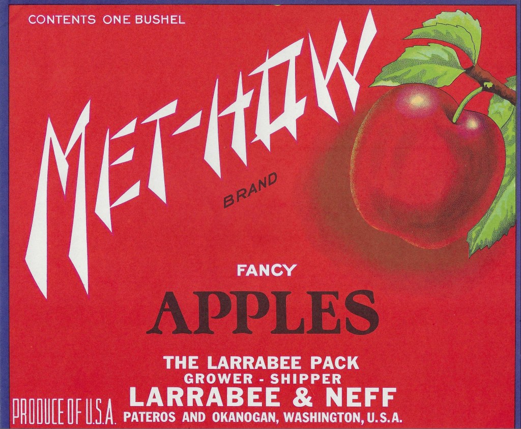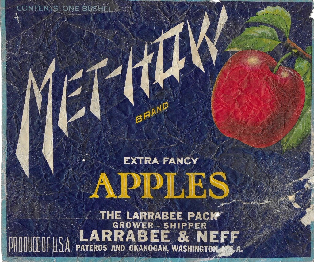 Eventually the Neff Orchards expanded to include acreage between Pateros and Brewster which was purchased in 1955 after John Larrabee’s death. In the 1980s when Okanogan and Wenatchee newspapers reported on the Larrabee and Neff orchards and their current operations, Joan described that the family had approximately 150 acres growing Red Delicious, Golden Delicious, Granny Smith, and some pears. Joan remembered that she “got her start early” when John Neff would bring home boards (”shook”) for his children to assemblage and put together apple boxes. For John Larrabee and the Neff’s, they consistently sold their apple crop under the brand created by Larrabee in the early-20th century called “Met-How”. It is one of the most well-known Pateros apple labels and is widely known. The labels feature the text “Met-How” angled across a blue or red background with a colorful red apple typically depicted in the corner. Larrabee and/or Neff are listed as the growers, packers and shippers depending on the pack (e.g., Extra Fancy, Fancy, etc.) and orchard location.