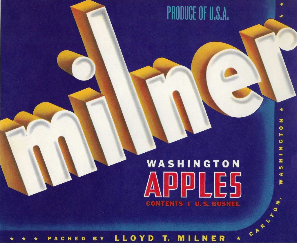 Of the apple brands and labels known from the Methow Valley, Culver’s is especially unique – and oddly specific in its imagery. Their standard label used the text “Culver” spread across a red or blue background with an image of a soldier standing at attention in the top corner. The labels typical stated “Culver Realty Co. Inc.” as the grower. Culver had extensive business partnerships throughout Washington, and this is also highlighted by his apples being sold as part of the Earl Fruit Company “Drake Apples” sold out of Wenatchee. It is unclear exactly when Culver began growing apples and when he subsequently stopped and sold his orchard, but by the early 1940s articles in the Methow Valley News indicate that the Milner family had bought the Culver orchards in Carlton and began selling under the Milner brand.