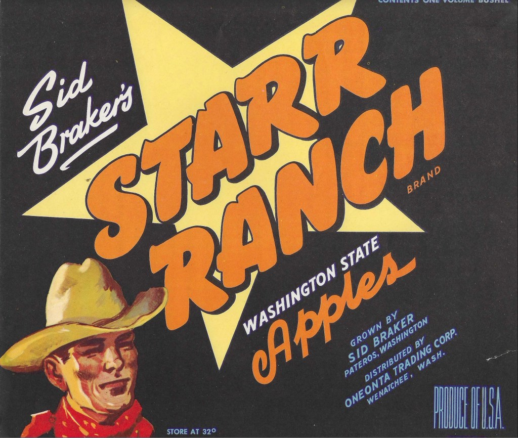 At some point during the early 1930s (perhaps 1934) local Brewster resident Sid Braker joined (or bought) the Starr Ranch and orchards. The well-known Starr Ranch apple label depicting a star with the text “Starr Ranch Brand Washington State Apples” and a cowboy figure in the lower corner stated that the apples were “grown by Sid Braker Pateros, Washington”. A known date for this apple label was 1938 (17), and prior to the sale of the orchards in the 1960s, Sid Braker was described as the owner in local newspapers. However, during this same early period, in 1934, Paul “Tommy” Thomas founded what is known today as the “Oneonta Trading Corporation”, according to their own company history (24). This history continues to note that: