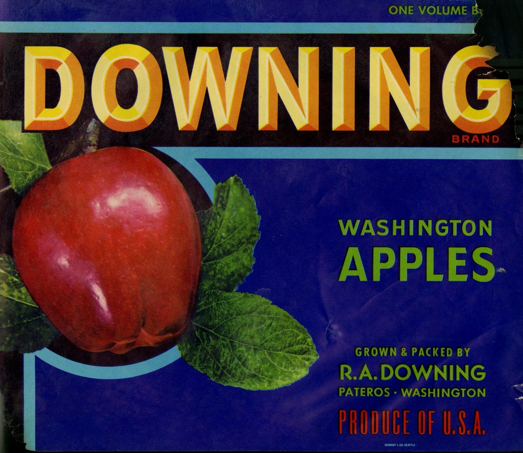 There is a known apple label with a dark blue background, shiny red apple, with yellow and golden lettering across the top spelling “Downing Brand Washington Apples”. These apples were “grown and packed” by R.A. Downing in Pateros. But, little is known – at least in historic records I could access – about Robert Alden Downing and his apple orchards. His 1951 obituary does indicate that he and his wife, Ruth Peckenpaugh, moved to Brewster from Spokane in 1915. During their time in Brewster, Downing was the mayor of the town for over seven years, was involved in the Commercial Club, First National Bank, Okanogan Valley Power Company, and several other organizations. His orchards were apparently located on the Bridgeport Bar (east of Pateros) but his packing shed was in Pateros, and the Shafer Museum does have a historic photograph in their collections taken during the 1948 flood showing Downing’s packing shed surrounded by water (2003.001.096). The Downing’s evidently had no children, and it appears that their apple orchards ceased selling under the “Downing” brand sometime after their death.