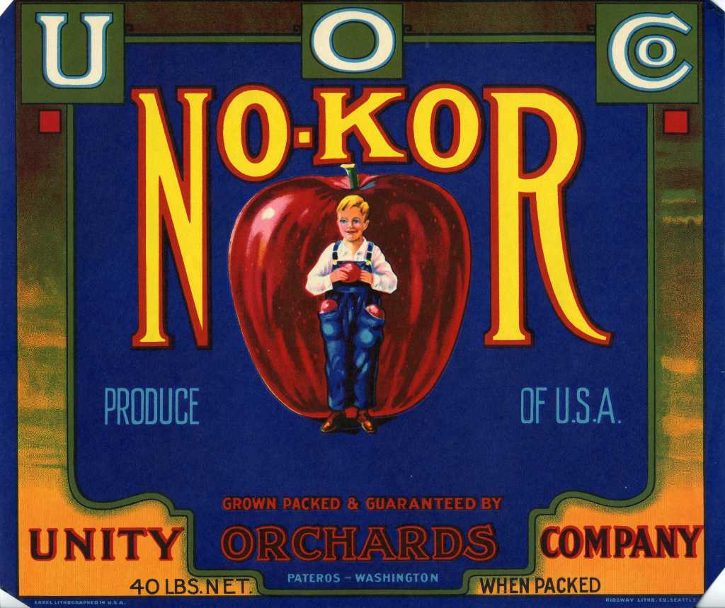 “exclusive distributors of the famous “NO-KOR” Brand packed by UNITY ORCHARDS CO., Pateros, Wash. 100 cars Delicious, Winesaps, Jonathans, and Spitz”