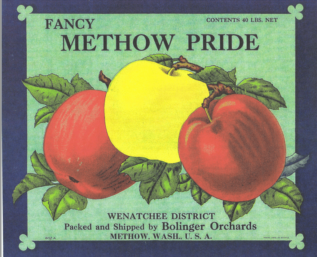 The following section attempts to present a record, albeit briefly and certainly incompletely, for each of the individual families that grew, picked, packed and sold apples under their unique brands. While the grade of apples sold from orchards became standardized throughout the Pacific Northwest in the 20th century (15-16) (Extra Fancy, Fancy, etc.), apple brands were highly individualized to each grower, family, or association. In some cases, individual growers combined efforts and sold together under one brand, but the important aspect of understanding the history of apple growers in Pateros and the lower Methow Valley is that these were orchards where owners sold their crop independently, and outside, of formal cooperative associations of packing sheds and warehouses or advertising agencies (these are described in the next section). Occasionally, individual growers would agree to sell their apples with larger associations, and that occurred within Pateros and the Methow Valley too. Today, these branding and advertising records have become collector items in the form of apple crates and apple labels (16), and many of the records presented here originate from various published accounts of apple label brands and/or museum and private collections of apple labels from the region (e.g., see 17). Other information on these families and growers derives from their own oral history interviews, newspaper articles and museum archives. My goal here is to try and capture the remarkable diversity and resiliency of apple growers and their families throughout the region for well over 100 years as broadly as possible to honor and commemorate their legacy – my own family was a part of this history and I hope these records help honor their orcharding and others.