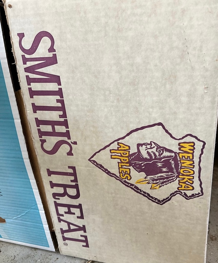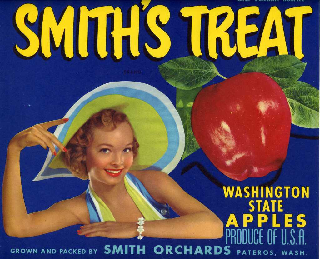 Eventually, with the construction of the Wells Dam and the forced removal of cold storage warehouses and packing facilities in downtown Pateros, Horace and his brother Roger decided to sell off their remaining orchards and warehouse and move on to different careers. The last Smith Orchards apples were likely picked and sold sometime during the late-1960s. Horace did have a separate cherry orchard after this, but the family did not resume growing apples or selling under their family brand. The Smith family sold their apples under the “Smith’s Treat” brand. This was an apple label with a blue background and yellow text angled across the front of the image. Interestingly, of the Washington state apple labels curated and digitized at the Smithsonian National Museum of American History in Washington, D.C., one label is from the Smith Orchards (#1361715). A second known Smith family apple label also used the “Smith’s Treat” text but depicted a woman lounging next to a red apple. The Smith family kindly provided a photograph of a ~1950s or 1960s era Smith’s Treat cardboard apple box as well (see below).