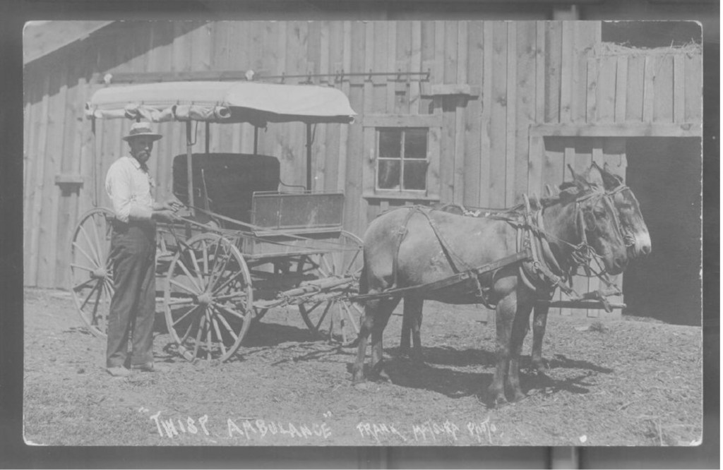 Although newspaper records are intermittent, by September 11, 1909, the Brewster Herald noted that Dr. Couche and his family were living in Twisp and were well-known in the community at that time. Being one of the first doctors in the Methow Valley certainly was significant. Photographer Frank Matsura captured a moment with Dr. Couche standing next to this “Ambulance” in Twisp during this period.