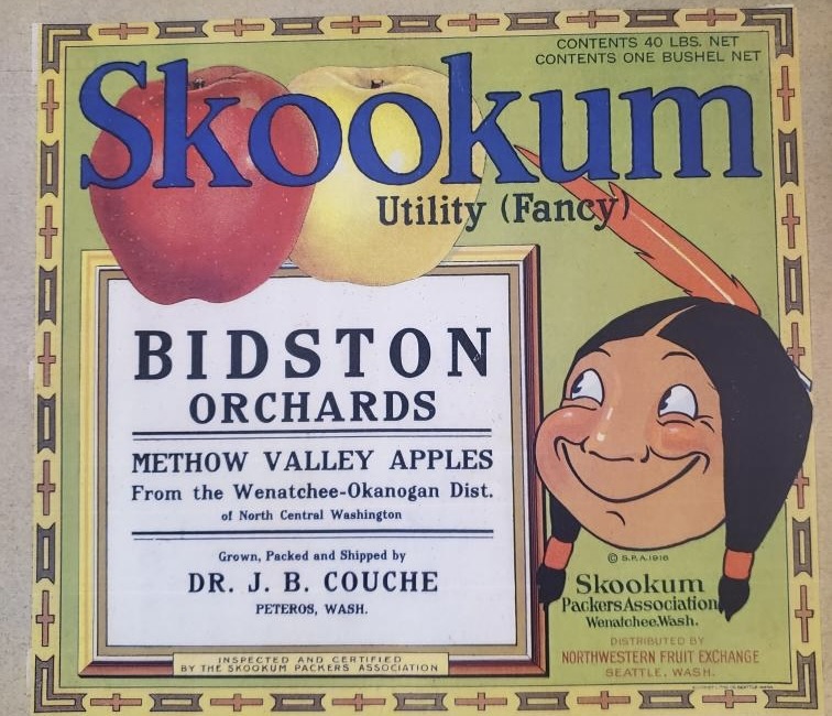 While there are few records of Dr. Couche owning and operating an orchard, several versions of a surviving Skookum apple label (see below) and one Methow Valley News article indicate that he did own an orchard, outside of Twisp, during the 1910s and early 1920s. Sold under the “Bidston” brand, the printers of this label accidentally misspelled the town name “Peteros” instead of Pateros. Bidston itself refers to the old, original village of Bidston found within the greater city of Birkenhead, England. Ken Couche indicated that one prominent feature of Bidston, even today, is a large windmill on top of the village hill. The windmill was originally used to pump water. Thus, a fitting name for the heavily irrigated orchards in the Methow Valley that Dr. Couche would have encountered during his time.