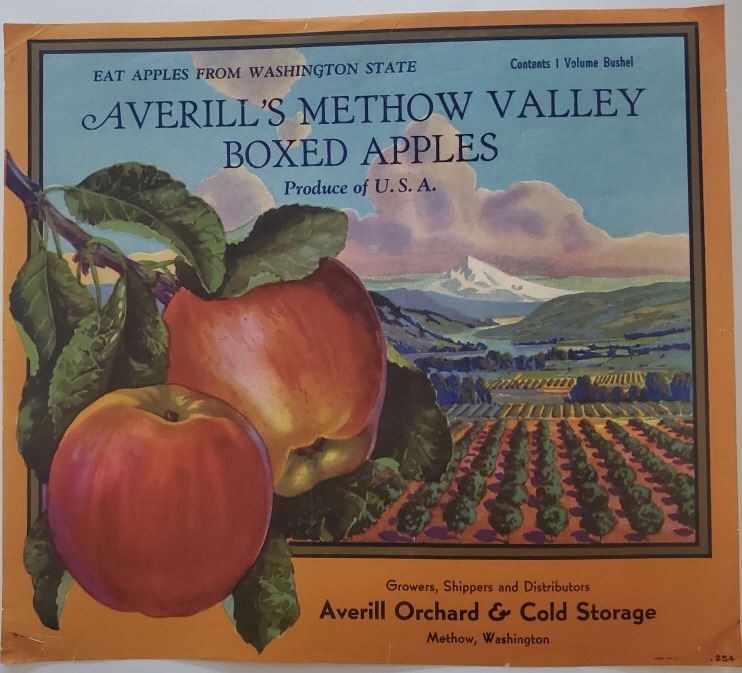 Peter Averill grew, packed, stored, and distributed his apples using a stock format label titled “Averill Methow Valley Boxed Apples” (see below). Although Peter Averill died in 1942, he and Clara had three sons. One son, Ira Averill, died tragically at the very young at the age of 29 in 1932. Peter and Clara’s two surviving sons, Mark and Ralph, both appear to have continued on in the orcharding and apple growing business throughout the mid-20th century until they likely sold their parent’s original ranch in ~1958. Mark Averill died in 1973. Ralph Averill died a few years later in 1978, after retiring in 1972 from his own orchard business in the Methow Valley. Both Mark and Ralph were married but neither had children and it is likely that the Averill apple brand ended in the early 1970s after Mark died and Ralph retired from the business.