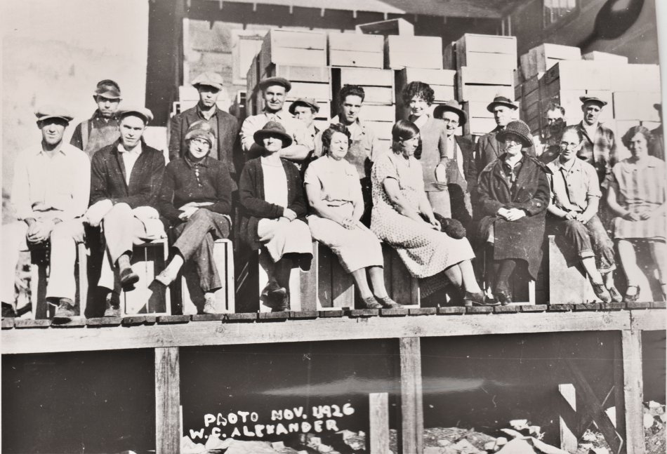 One surviving November 1926 photograph in the Okanogan County Historical Society records shows Roy Smith’s packing crew at his shed in Brewster.